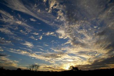 Keywords: sky clouds sunset rays blue grey white horizon trees australia