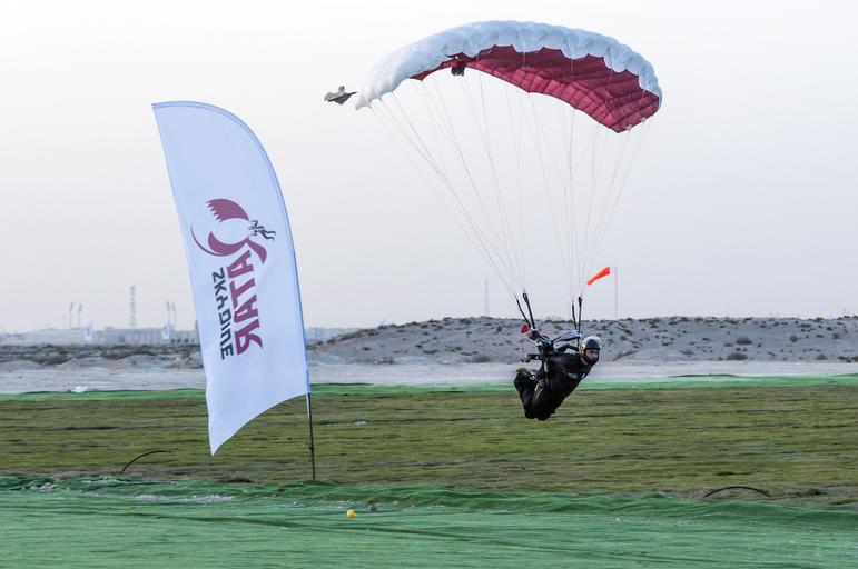 Keywords: skydiving extreme sports landing parachute paragliding competition finish qatar