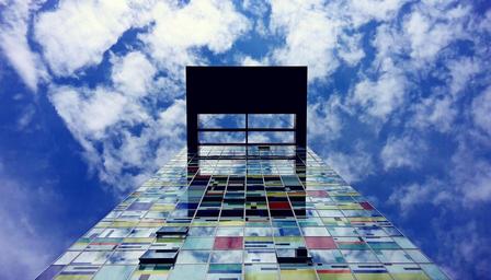 Keywords: skyscraper architecture media harbour düsseldorf germany facade glass facade modern futuristic perspective mirroring building sky glass window clouds city blue high sunlight office building modern architecture rhine river glass design colorful