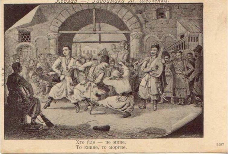 | Keywords: Slastion-Kobzar from Haidamaky.jpg Artwork by Ukrainian artist Opanas Slastion Кобза Ілюст ації до поеми Та аса Шевченка Гайдамаки http //www batckivchina uaforums net/--vt586 html highlight s 1900 Opanas Slastion PD-old Opanas Slastion Ukraine in art Folk dance of Ukraine Ethnography of Ukraine |
