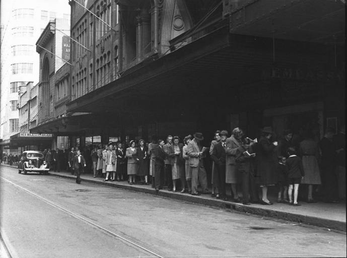 | Keywords: SLNSW 28667 Theatre queue for Esquire Embassy Theatre taken for Fox Films.jpg en Theatre queue for Esquire Embassy Theatre taken for Fox Films 22/4/1946 http //www acmssearch sl nsw gov au/search/itemDetailPaged cgi itemID 28667 item <br/>http //www acmssearch sl nsw gov au/search/itemDetailPaged cgi itemID 37473 album <br/>http //www acmssearch sl nsw gov au/search/itemDetailPaged cgi itemID 395018 collection Creator Sam Hood This image may be used freely without requesting permission The State Library of New South Wales http //www acmssearch sl nsw gov au/search/itemPopLarger cgi itemID 28667 requests acknowledgement that the image is from the collections of the State Library of NSW Photographs 32812 images copied from glass and cellulose nitrate photonegatives The Library first purchased a large collection of negatives from Gladys Hood in 1972 This collection which included nitrate negatives which have subsequently been copied at DG 0N4 NCY 28-61 was transferred to a videodisc in 1991 and each image indexed individually Ted Hood assisted with the indexing; images were also identified using surviving studio registers The videodisc known as the Home Away disc or simply the Hood collection was digitised in 1996 and mounted on the Internet with upgraded index records via the online catalogue in December 1998 Purchased from Gladys Hood 1972 Copyright restrictions may apply - Photographs in this collection created before 1955 are all out of copyright Photographs created after 1955 are in copyright for the life of creator plus 70 years ; Please acknowledge - Mitchell Library State Library of New South Wales and Courtesy copyright holder 395018 Sam Hood photographic collection 1916-ca 1955 Approximately 44 800 negatives ; 7 309 photographic prints ; 3 boxes of textual material ; 6 film reels The Library first purchased a large collection of negatives from Gladys Hood in 1972 This collection which included nitrate negatives which have subsequently been copied at DG 0N4 NCY 28-61 was transferred to a videodisc in 1991 and each image indexed individually Ted Hood assisted with the indexing; images were also identified using surviving studio registers The videodisc known as the Home Away disc or simply the Hood collection was digitised in 1996 and mounted on the Internet with upgraded index records via the online catalogue in December 1998 ; Another collection from Sam Hood's studio was purchased in 1993 from Gladys Hood's descendants This comprised 7300 photoprints PXE 789 and ca 12000 negatives ON 204 Digitisation of important photographs in PXE 789 began Mar 2002 but ON 204 has not been digitised and must be viewed at the Library Samuel J Hood's 1872-1953 claimed to have been born 1870 but the South Australian Birth Index gives date as 20 August 1872 His career as a photographer began in the 1880s ; He ran a successful business in ships portraits these negatives are now held by the Australian National Maritime Museum Sydney and portraits of people in the late nineteenth - early twentieth century The State Library has little representation of this period In 1918 he acquired the Dalny Studio at 124 Pitt Street and began to expand his business into press photography providing photographs for the Sydney Mail the Australasian the Daily Guardian the Daily Telegraph Pictorial the Labor Daily the Sun the Daily News and the Sydney Morning Herald Press photography increasingly came to dominate his business and in 1934 he joined the Labor Daily for a short time as a full-time photographer engaging other staff to look after his studio ; By the mid-1930s most newspapers employed their own photographers and Hood's commissions from the papers began to decline Hood sought other kinds of commissions and won a number of long term advertising and commercial contracts He contributed a number of photographs of Sydney buildings and streets to Building Construction and Australasian Engineer during the late 1930s and early 1940s Hood also had extensive contacts in the entertainment industry who called upon him to document celebrity events and stars as well as theatre advertising Throughout his career he worked at the stock-in-trade for commercial photographers portraits weddings and even funerals ; A number of photographers worked for Dalny Studio some of these include Ernie Bowen Gus Daley Jack Lazern Lethington Maitland as well as Sam's own children Gladys and Ted ; For detailed biographical information about photographer Sam Hood see Sydney exposures through the eyes of Sam Hood his Studio 1925-1950 / Alan Davies Sydney State Library of New South Wales 1991 Out of copyright - Created before 1955 Photographs ; Please acknowledge - Mitchell Library State Library of New South Wales advertising photography; commercial photography; photojournalism 395018 Original item no NCY46/268 yes no PD-Australia PD-1996 Australia Images from the State Library of NSW album 37473 SLNSW media uploaded by User 99of9 Photographs by Sam Hood |