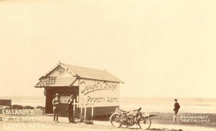 Keywords: SLNSW 796225 Collaroys Up to Date Estate Agency Dwight amp Frazer Property Agents.jpg Photographs 1073 postcards silver gelatin photoprints b w and hand col ; 8 8 x 14 cm -14 x 8 8 cm ; Ephemera 1 pamphlet William Henry Broadhurst was born at Maitland on 13th August 1855; he died aged 72 on 29 July 1927 He moved to Ashfield Sydney and began employment as a surveyor's assistant working mainly on the south coast of NSW He turned his interest in photography into a business and from around 1900 began to publish postcards Many of the photographs were hand coloured for sale by his daughters To secure his photographs he travelled by train and then walked wherever he wanted to go -- Reference source Illawarra Historical Society Bulletin September 1970 pp 2-3 PXA 635/1071 Presented 1970; Pic Acc 2048 For access to this material please contact the Head of Pictures Section - M A B often appears on the front of Broadhurst postcards The name M Broadhurst also appears on the back of some postcards eg PXA 635/179 The identity and significance of this anomaly is unknown This collection has been arranged by geographical location You may navigate from this collection record to these individual records 796225 Collaroy's Up to Date Estate Agency Dwight Frazer Property Agents Postcards of New South Wales Collaroy New South Wales |