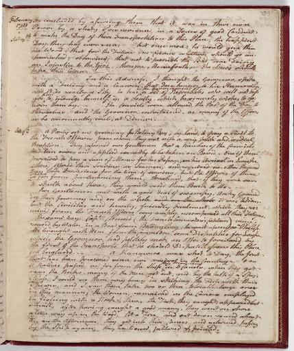 | Keywords: SLNSW 811244 p23.jpg Aggregated Collection Textual Records Graphic Materials The First Fleet consisting of 11 vessels was the largest single contingent of ships to sail into the Pacific Ocean Its purpose was to found a convict settlement on the east coast of Australia at Botany Bay ; The First Fleet sailed from England on 13 May 1787 carrying more than 1 500 people and arrived at Botany Bay eight months later on 18 January 1788 Governor Arthur Phillip rejected Botany Bay choosing instead Port Jackson to the north as the sight for the new colony; they arrived on 26 January 1788 The Fleet consisted of two naval escorts HMS Supply and the flagship HMS Sirius carrying the Governor; six convict transports the Alexander Charlotte Friendship Lady Penrhyn Prince of Wales and the Scarborough; and three storeships the Borrowdale Fishburn and Golden Grove This selection comprises ten of the eleven known First Fleet journals including two versions of Philip Gidley King's journal; and correspondence and artworks of First Fleeters First Fleet 1787-1788 ; New South Wales -- History -- 1788-1851 811244 p 23 Journal of George Bouchier Worgan |