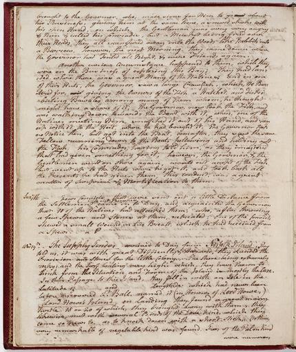 | Keywords: SLNSW 811247 p26.jpg Aggregated Collection Textual Records Graphic Materials The First Fleet consisting of 11 vessels was the largest single contingent of ships to sail into the Pacific Ocean Its purpose was to found a convict settlement on the east coast of Australia at Botany Bay ; The First Fleet sailed from England on 13 May 1787 carrying more than 1 500 people and arrived at Botany Bay eight months later on 18 January 1788 Governor Arthur Phillip rejected Botany Bay choosing instead Port Jackson to the north as the sight for the new colony; they arrived on 26 January 1788 The Fleet consisted of two naval escorts HMS Supply and the flagship HMS Sirius carrying the Governor; six convict transports the Alexander Charlotte Friendship Lady Penrhyn Prince of Wales and the Scarborough; and three storeships the Borrowdale Fishburn and Golden Grove This selection comprises ten of the eleven known First Fleet journals including two versions of Philip Gidley King's journal; and correspondence and artworks of First Fleeters First Fleet 1787-1788 ; New South Wales -- History -- 1788-1851 811247 p 26 Journal of George Bouchier Worgan |