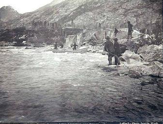 | Keywords: Small boat shooting the rapids on One Mile River between Bennett Lake and Lindeman Lake, British Columbia, 1897 (LAROCHE 301).jpeg check categories 9 June 2016 4 Photograph Creator Frank La Roche Caption on image Shooting rapids between Lakes Lindeman and Bennett Rapids on Lewes River Skill cool heads and hard work are the necessary requirements for navigating the rapids of the Lewes River Here is portrayed an exciting scene similiar to which everyone who goes to the Klondike in the same way must experience Partly guided by ropes in the hands of men ashore and steered clear of dangerous rocks by men in the boat the frail craft dashes and struggles along at one time miraculously escaping destruction in a wild eddy and at another time gliding gracefully between jagged rocks that rise threateningly out of the seething waters There is no time to think - a sharp lookout and a steady hand are the only means to victory over the angry waters of the rapids one meets en route to the Klondike Frank La Roche En Route to the Klondike 1898 Klondike Gold Rush Subjects LCTGM Canoes--British Columbia; Rowboats--British Columbia; Rapids--British Columbia; Rivers--British Columbia Subjects LCSH One Mile River B C depicted place British Columbia 1897 Institution University of Washington UWASH-LAROCHE-source accession number laroche 301 PD-old-auto-1923 1936 Information field Order Number LAR186 Images from the Frank La Roche Photographs Collection to check Canoes Rowboats Rapids Rivers of British Columbia |