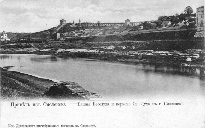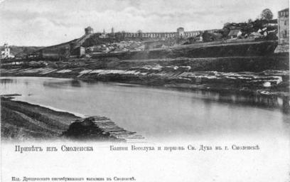 | Keywords: Smolensk fortress wall 12.jpg en View of part of the Smolensk fortress wall with towers Kopytenskoy Veseluhoy Pozdnyakova Volkova from the opposite bank of the Dnieper ru Вид на часть Смоленской к епостной стены с башнями Копытенской Веселухой Поздняковой Волковой с д угого бе ега Днеп а О игинальная отк ытка е установлены before 1917 года PD-RusEmpire 20th-century postcards of Russia Postcards of Smolensk Historical photos of Smolensk fortress Dnieper River in Smolensk | ||||