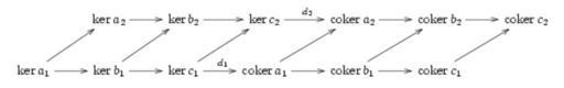 Keywords: Snake lemma nat2.png Snake lemma nat2 svg A commutative diagram with exact rows showing the naturality of the snake lemma Produced with TeX and XY-Pic using the source code below Both the image and the source code are in the public domain <pre> Produce a postscript file from this input with tex and dvips Loading the XY-Pic package \input xy \xyoption all Using postscript driver for smoother curves \xyoption ps \xyoption dvips No need for page numbers \nopagenumbers \def\coker \mathop \rm coker \xymatrix Our diagram is a 2x7 matrix \ker a_2\arr \ker b_2\arr \ker c_2\arr d_2 \coker a_2\arr \coker b_2\arr \coker c_2\\ \ker a_1\arr\arur \ker b_1\arr\arur \ker c_1\arr d_1 \arur \coker a_1\arr\arur \coker b_1\arr\arur \coker c_1\arur \end </pre> http //en wikipedia org/wiki/Image Snake_lemma_nat2 png 2004-01-29 Axel Boldt Both the image and the source code are in the public domain and Since I believe that intellectual property rights do not exist as we mere mortals cannot arrogate the right to own parts of Plato's eternal heaven of ideas every word I write is by default and always in the public domain http //en wikipedia org/wiki/User AxelBoldt complexes algebra Xy-pic diagrams