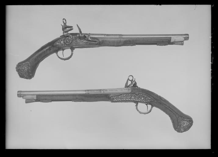 Keywords: Snapplåspistol med lås alla moda, Francesco Antonio Garcia, Madrid 1778 - Livrustkammaren - 10228.tif Slätborrad pipa av stål med åttsidig kammare kammarens främre del samt resten av pipan sextonsidig på varannan fas på kammarens främre del bladstavar de övriga räfflade Vid kammarens framände en ring samt en ring med en fläta vid mynningen enbladstav På kammarens åttsidig del vid pipbasen guldstämplar kvadratisk stämpel med namnchiffer MADRID ihopskrivet till MD flankerat av björn och grip samt krönt av kunglig krona Namnstämpel FRAN // ANTON // GARCIA krönt av kunglig krona därframför en liljeformig stämpel samt ett devotionskors på sidofaserna liljestämplar Framför stämplarna graverad signatur på mittfasen FRAN CO ANT O GARZIA NT och AR ligaturer till v EN MADRID till h ANO DE 1778 Böjt svansskruvblad med rundad ände dekor i stålsnitt i form av en trofégrupp framför och blad bakom krysskruvens hål Guldfodrat fänghål <br/>Fästning Ett häfte Pipan fäst med krysskruv samt ett pipstift av stål <br/><br/>Snapplås alla moda plant låsbleck med fasade kanter dekor i stålsnitt i form av trofégrupper Mellan batterifjäderns armar graverad signatur FRAN CO ANT O GARCIA på fasen därnedanför EN MADRID 1778 S-formig svagt välvd hane med rankdekor i stålsnitt ranka mellan hals och rygg Helspänn på hak på hanryggen halvspänn på utskott på hanens framsida Hangren med rankor kantiga käkar överkäken lös på överkäkens översida rankdekor käkskruvhuvud i form av ring Kantig fängpanna med fals dekor i stålsnitt på ytteränden Batteri med plant lock med fasade kanter eldstål med trofégrupp i stålsnitt fot i form av delfin Batterifjäder med delvis fasade kanter fjäderlöv i form av fransk lilja S-formig nötstudel med graverad dekor <br/>Fästning Två låsskruvar <br/>Svagt svängd avtryckare Avtryckarbleck av stål <br/><br/>Helstock av valnöt enkelt snidat blad vid svansskruvbladet och spetsrörkan På kolvhalsens v sida vid tumplåten ett otydligt stämplat nr 500 <br/>Näsband av vitt horn övriga beslag av silver med reliefdekor Kolvkappa med långa flikar dekor av bandomlindade något skålade lister blom- och bladstavar samt trofégrupper centrumplatta med åttbladig blomma Oval tumplåt med droppformig sköld omgiven av blomrankor bandomlindade kantlister Helt sidbleck med bandomlindade kantlister samt spridda troféer En + en rörka på spetsrörkan en trofégrupp samt en blomranka på överrörkan en mask och en blomma Varbygel med dekor av blomrankor på framarmen en spetsoval platta med blad uppstigande ur korgliknande ornament på bygeln en trofégrupp och kantlister <br/><br/>Tillbehör <br/>Laddstock av ebenholts l 158 mm framtill en konisk silverskoning l 28 mm <br/> <br/><br/> 4 <br/>Gustaf V s vapensmaling nr 14 a Seitz förteckning deposition till LRK 1937-10-13 överlämnad som gåva 1957-03-05 från Gustaf VI Adolf gm K Husgerådskammaren <br/><br/>Katalogisering Nils Drejholt 1970-08-13 utskrift NDt 1997-07-11 <br/><br/>Låstypen kallad Madrid-lås se LRK M15094 Se Stöckel plansch 1 <br/><br/>Litteratur <br/>Drejholt Nils Firearms of the Royal Armouries II Stockholm 2007 GV nr 14 sid 184 b <br/><br/> Hantverkarregister kort nr 622 - Francisco Garcia Madrid original caption 1778 walnut e3 - eldvapen - stock material valnöt - steel e12 - eldvapen - pipa och lås material stål - silver e79 - eldvapen - stockbeslag och laddstock material silver - horn Färg vit e7 - eldvapen - stockbeslag material horn - gold e5 - eldvapen - pipdekor material guld - ebony e9 - eldvapen - laddstock material ebenholts size mm 166 g 1150 size mm 309 pipa size mm 481 LRK Gustaf V av Sverige FRAN ANTON GARZIA kunglig krona anv e1 - eldvapen - pipa; Francisco Antonio García FRAN CO ANT O GARZIA EN MADRID ANO DE 1778 anv e12 - eldvapen - pipa och lås; Francisco Antonio García MADRID namnchiffer ihopskrivet till MD anv e1 - eldvapen - pipa; Francisco Antonio García FRAN ANTON GARZIA kunglig krona anv e1 - eldvapen - pipa; Francisco Antonio García FRAN CO ANT O GARZIA EN MADRID ANO DE 1778 anv e12 - eldvapen - pipa och lås; Francisco Antonio García MADRID namnchiffer ihopskrivet till MD anv e1 - eldvapen - pipa; Francisco Antonio García place of origin original filename LN_B13811_016691 40421 inventory number LRK 4288 10228 CC0 Snapplåspistol med lås alla moda Francesco Antonio Garcia Madrid 1778 - Livrustkammaren - 10228-negative tif Flintlock pistol Images from Livrustkammaren Media contributed by LSH dim-with multiple size templates Media contributed by LSH unmatched creator Media contributed by LSH 2013-10 |