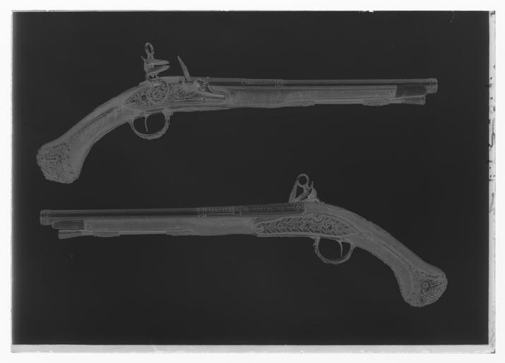 Keywords: Snapplåspistol med lås alla moda, Francesco Antonio Garcia, Madrid 1778 - Livrustkammaren - 10228-negative.tif Slätborrad pipa av stål med åttsidig kammare kammarens främre del samt resten av pipan sextonsidig på varannan fas på kammarens främre del bladstavar de övriga räfflade Vid kammarens framände en ring samt en ring med en fläta vid mynningen enbladstav På kammarens åttsidig del vid pipbasen guldstämplar kvadratisk stämpel med namnchiffer MADRID ihopskrivet till MD flankerat av björn och grip samt krönt av kunglig krona Namnstämpel FRAN // ANTON // GARCIA krönt av kunglig krona därframför en liljeformig stämpel samt ett devotionskors på sidofaserna liljestämplar Framför stämplarna graverad signatur på mittfasen FRAN CO ANT O GARZIA NT och AR ligaturer till v EN MADRID till h ANO DE 1778 Böjt svansskruvblad med rundad ände dekor i stålsnitt i form av en trofégrupp framför och blad bakom krysskruvens hål Guldfodrat fänghål <br/>Fästning Ett häfte Pipan fäst med krysskruv samt ett pipstift av stål <br/><br/>Snapplås alla moda plant låsbleck med fasade kanter dekor i stålsnitt i form av trofégrupper Mellan batterifjäderns armar graverad signatur FRAN CO ANT O GARCIA på fasen därnedanför EN MADRID 1778 S-formig svagt välvd hane med rankdekor i stålsnitt ranka mellan hals och rygg Helspänn på hak på hanryggen halvspänn på utskott på hanens framsida Hangren med rankor kantiga käkar överkäken lös på överkäkens översida rankdekor käkskruvhuvud i form av ring Kantig fängpanna med fals dekor i stålsnitt på ytteränden Batteri med plant lock med fasade kanter eldstål med trofégrupp i stålsnitt fot i form av delfin Batterifjäder med delvis fasade kanter fjäderlöv i form av fransk lilja S-formig nötstudel med graverad dekor <br/>Fästning Två låsskruvar <br/>Svagt svängd avtryckare Avtryckarbleck av stål <br/><br/>Helstock av valnöt enkelt snidat blad vid svansskruvbladet och spetsrörkan På kolvhalsens v sida vid tumplåten ett otydligt stämplat nr 500 <br/>Näsband av vitt horn övriga beslag av silver med reliefdekor Kolvkappa med långa flikar dekor av bandomlindade något skålade lister blom- och bladstavar samt trofégrupper centrumplatta med åttbladig blomma Oval tumplåt med droppformig sköld omgiven av blomrankor bandomlindade kantlister Helt sidbleck med bandomlindade kantlister samt spridda troféer En + en rörka på spetsrörkan en trofégrupp samt en blomranka på överrörkan en mask och en blomma Varbygel med dekor av blomrankor på framarmen en spetsoval platta med blad uppstigande ur korgliknande ornament på bygeln en trofégrupp och kantlister <br/><br/>Tillbehör <br/>Laddstock av ebenholts l 158 mm framtill en konisk silverskoning l 28 mm <br/> <br/><br/> 4 <br/>Gustaf V s vapensmaling nr 14 a Seitz förteckning deposition till LRK 1937-10-13 överlämnad som gåva 1957-03-05 från Gustaf VI Adolf gm K Husgerådskammaren <br/><br/>Katalogisering Nils Drejholt 1970-08-13 utskrift NDt 1997-07-11 <br/><br/>Låstypen kallad Madrid-lås se LRK M15094 Se Stöckel plansch 1 <br/><br/>Litteratur <br/>Drejholt Nils Firearms of the Royal Armouries II Stockholm 2007 GV nr 14 sid 184 b <br/><br/> Hantverkarregister kort nr 622 - Francisco Garcia Madrid original caption 1778 walnut e3 - eldvapen - stock material valnöt - steel e12 - eldvapen - pipa och lås material stål - silver e79 - eldvapen - stockbeslag och laddstock material silver - horn Färg vit e7 - eldvapen - stockbeslag material horn - gold e5 - eldvapen - pipdekor material guld - ebony e9 - eldvapen - laddstock material ebenholts size mm 166 g 1150 size mm 309 pipa size mm 481 LRK Gustaf V av Sverige FRAN ANTON GARZIA kunglig krona anv e1 - eldvapen - pipa; Francisco Antonio García FRAN CO ANT O GARZIA EN MADRID ANO DE 1778 anv e12 - eldvapen - pipa och lås; Francisco Antonio García MADRID namnchiffer ihopskrivet till MD anv e1 - eldvapen - pipa; Francisco Antonio García FRAN ANTON GARZIA kunglig krona anv e1 - eldvapen - pipa; Francisco Antonio García FRAN CO ANT O GARZIA EN MADRID ANO DE 1778 anv e12 - eldvapen - pipa och lås; Francisco Antonio García MADRID namnchiffer ihopskrivet till MD anv e1 - eldvapen - pipa; Francisco Antonio García place of origin original filename LN_B13811_016691 40421 inventory number LRK 4288 10228 CC0 Snapplåspistol med lås alla moda Francesco Antonio Garcia Madrid 1778 - Livrustkammaren - 10228 tif |