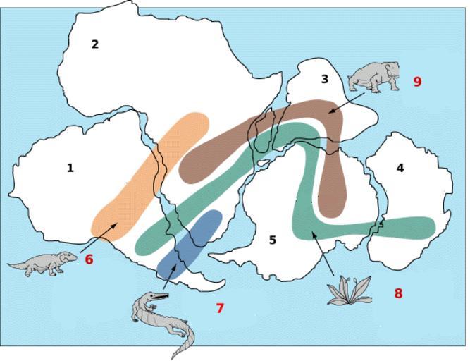 | Keywords: Snider-Pellegrini Wegener fossil map-i18n.png Internationalization of the diagram Snider-Pellegrini-Wegener-fossil-map<br> 1-South-America<br> 2-Africa<br> 3-India<br> 4-Australia<br> 5-Antarctica<br> 6-Fossil remains of Cynognathus a Triassic land reptile approximately 3m long <br> 7- Fossil remains of the freshwater reptile Mesosaurus<br> 8-Fossil of the fern Glossopteris found in all of the southern continents show that they were once joined<br> 9-Fossil evidence of the Triassic land reptile Lystrosaurus<br> http //wrgis wr usgs gov/docs/parks/pltec/pangea html USGS/USA-Gov modified by Eurico Zimbres Free for all use Maps of past tectonic plates Triassic geography Lystrosaurus Glossopteris PD-USGov Mesosaurus Fossils of India |