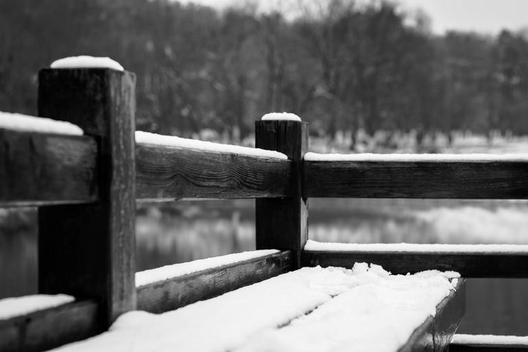 Keywords: snow black and white bench park lakefront