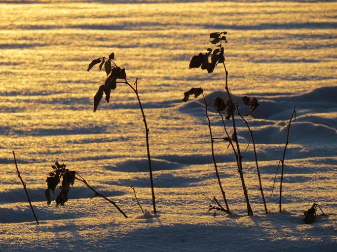 Keywords: snow landscape snowfield back light sun sparkle golden snow snowy plant stinging nettles
