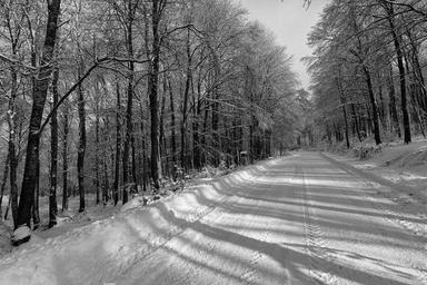 Keywords: snow road vitsi winter kastoria trees forest black and white