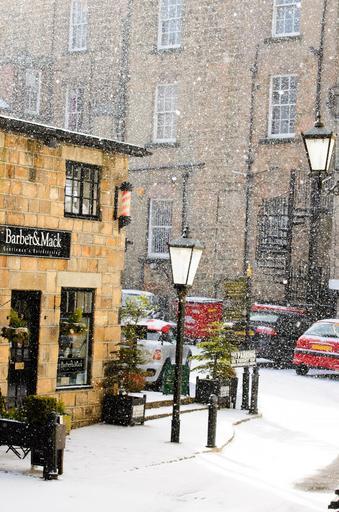 Keywords: snow snowflakes seasons april winter cloudy clouds buildings city architecture england background cold white weather town