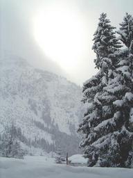 Keywords: snow tree mountain wintry road winter cold frost fog snowfall sun clouds light firs