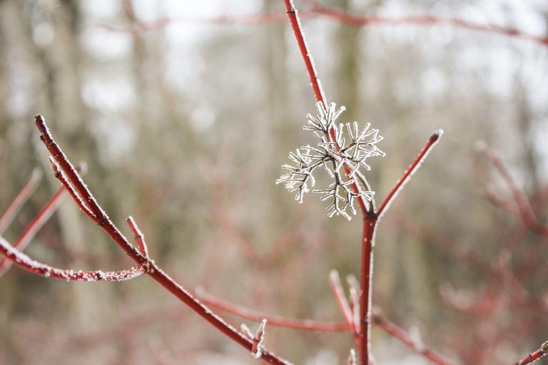 Keywords: snowflake twig plant branch tree red winter snow forest field trail nature
