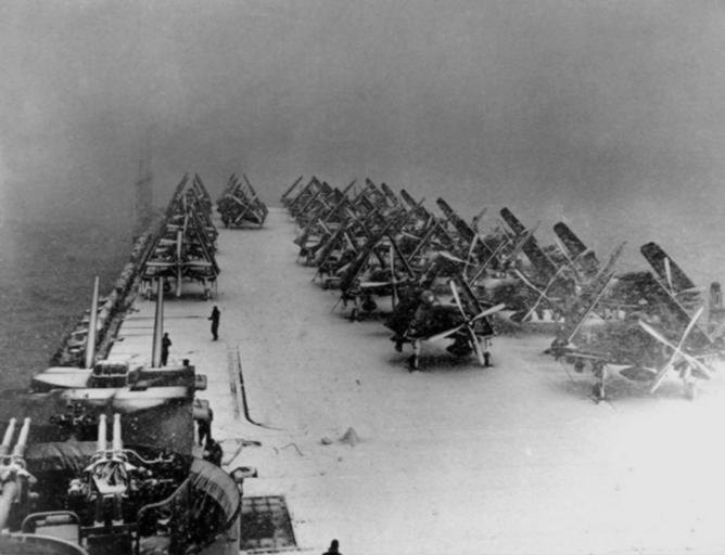 | Keywords: Snowy flight deck on USS Philippine Sea Nov 1950.jpg en USS Philippine Sea CV-47 flight deck scene looking aft from the island as the carrier is enveloped in a snowstorm off the Korean coast 15 November 1950 Planes on deck include Vought F4U-4B Corsair fighters and Douglas AD Skyraider attack planes Note men on deck apparently tossing snowballs and what may be a toppled snowman just in front of the amidships elevator National Archives Photo http //www history navy mil/photos/images/g430000/g439869c htm 80-G-439869 Naval Historical Center 1950-11-15 PD-USGov-Military-Navy thumb left Aboard USS Philippine Sea CV-47 F4U Corsairs in the Korean War F4U-4B Corsair |