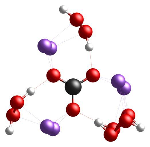| Keywords: Sodium-percarbonate-xtal-100K-2003-CM-3D-balls-C-coord-1.png Ball-and-stick model of the coordination environment of carbonate in the crystal structure of sodium percarbonate Na<sub>2</sub>CO<sub>3</sub>·1 5H<sub>2</sub>O<sub>2</sub> Colour code Sodium Na purple Carbon C grey-black Oxygen O red Hydrogen H white Crystal structure from http //dx doi org/10 1107/S0108768103012291 Acta Cryst 2003 B59 596 605 Model constructed and image generated in http //www crystalmaker com/ CrystalMaker 8 2 Own 2010-05-30 Ben Mills Benjah-bmm27 Images by Ben Mills Crystal structures of sodium percarbonate |