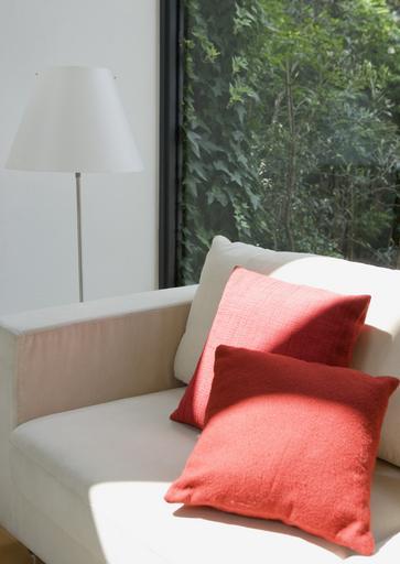 Keywords: white carpet couch sofa leather red pillow modern room nobody copy dwelling contemporary light concrete cozy wall furniture interior settee inside home house stylish background space residence comfortable indoors