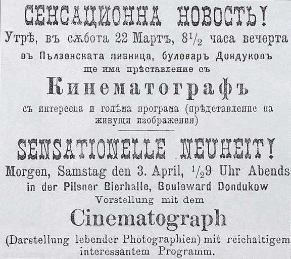 | Keywords: Sofia movie 1897.jpg Announcement for the first movie shown in Sofia Bulgaria Ки аджиев Светлин 2006 София 125 години столица 1879-2004 година ИК Гутенбе г ISBN 978-954-617-011-8 1897 author Anonymous-EU History of Sofia 22 March Cyrillic writing 1897 in Sofia Cinematography Cinemas in Sofia |