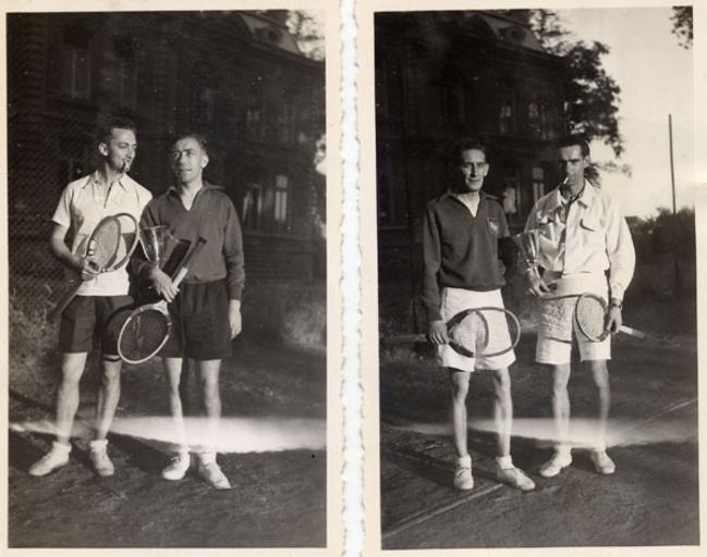 | Keywords: Soh.jpg Dirigeants du Sport Ouvrier Hellemmois en 1946 de gauche à droite Marcel Delattre Gilbert Ronse Alfred Leroy et Robert Vilain 2007-04-08 own assumed Adelattre Tennis in France 1946 in France Hellemmes-Lille Black and white photographs of tennis |