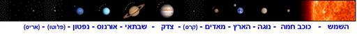 Keywords: Solar System XXVII HE.png The Solar System The Sun Inner solar system <ol start 2 > <li>Mercury <li>Venus <li>Earth and its moon Luna <li>Mars and its moons Phobos Deimos <li>The asteroid belt; including Ceres</ol> Middle solar system <ol start 7 > <li>Jupiter and its planemo moons Io Europa Ganymede Callisto <li>Saturn and its planemo moons Mimas Enceladus Tethys Dione Rhea Titan Iapetus <li>Uranus and its planemo moons Miranda Ariel Umbriel Titania Oberon <li>Neptune and its planemo moon Triton</ol> Outer solar system <ol start 11 > <li>The Kuiper belt; including Pluto and its moons Charon Nix Hydra <li>The scattered disc; including Eris and its moon Dysnomia <li>The Oort cloud</ol> Authorship This is an Hebrew Right-to-Left version of Image Solar System XXVII RTL png primarily created by The Enlightened with support fromOzlawyer Nbound BlytheG and others at Template Footer_SolarSystem The Enlightened Solar System |