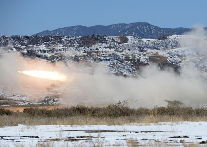 Keywords: Soldiers fire rocket from M142 High Mobility Artillery System