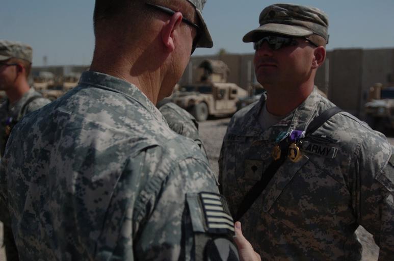 Keywords: Soldiers recognized for sacrifices DVIDS53906.jpg en Killeen Texas native Spc Terry White an infantryman with Company A 2nd Battalion 5th Cavalry Regiment 1st Brigade Combat Team 1st Cavalry Division stands in formation after receiving the Purple Heart from Roundup Mont native Col Paul E Funk II commander of 1st BCT at Patrol Base Courage in western Baghdad Aug 11 The Purple Heart is bestowed upon Soldiers wounded in combat 2007-08-11 Spc Leith Edgar https //www dvidshub net/image/53906 53906 2007-08-16 15 57 FORWARD OPERATING BASE COURAGE IQ PD-USGov 1st Cavalry Division United States Images from DoD uploaded by Fæ Presentation of the Purple Heart |