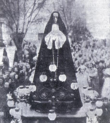 Keywords: Soledad 1898.jpg es Paso de la Virgen de la Soledad de Salamanca en la procesión del Santo Entierro celebrada el Viernes Santo 8 de abril de 1898 a su paso por la plaza de las Agustinas 1898-04-08 Revista Madrugada Hermandad Dominicana de Salamanca anonymous Custom license marker 2013 08 24 PD-old Holy Week in Salamanca 1898 in Spain Uploaded with UploadWizard Church sculptures in the province of Salamanca Statues of Mater dolorosa in Spain Statues of Virgin Mary in Castile and León |
