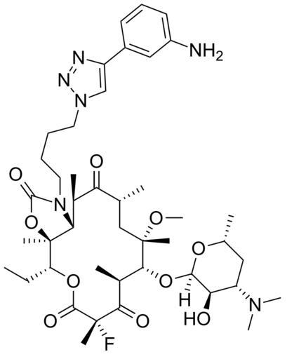 Keywords: Solithromycin.svg Chemical structure of Solithromycin Own 17 46 28 February 2011 UTC Ed Edgar181 Macrolide antibiotics Triazoles