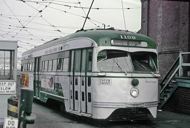 Keywords: san francisco sanfrancisco car vehicle outdoor MUNI PCC 1109, a K INGLESIDE CONNECTION OCEAN TO SAN JOSE backing into carhouse at San Jose Ave. and Geneva Ave. in San Francisco, CA on August 24, 1967. MUNI PCC 1109, a K INGLESIDE CONNECTION OCEAN TO SAN JOSE backing into carhouse at San Jose Ave. and Geneva Ave. in San Francisco, CA on August 24, 1967.