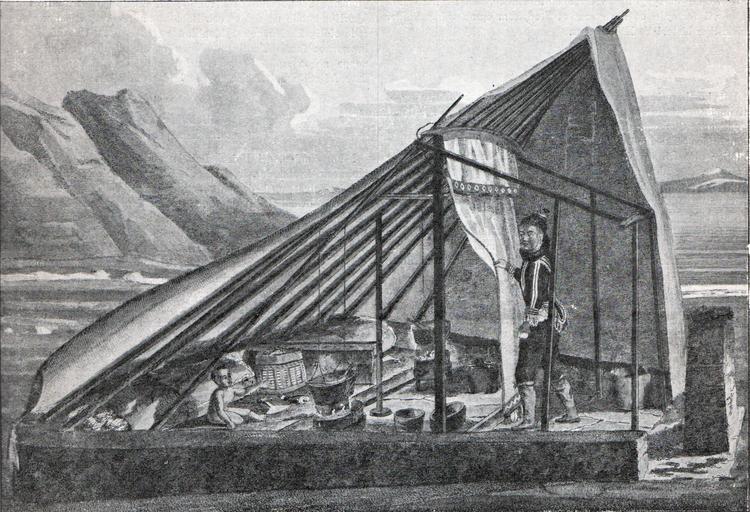 Keywords: Sommertelt.jpg Da Sommertelt i Østgrønland; Graahs rejse 1828-31 Før og Nu Historisk topografisk tidsskrift og illustrationsværk 1919 redigeret af F Zachariae 1919 Stik af H G F Holm og J Holm hans far efter tegning af W A Graah på hans Undersøgelsesrejse til Grønland i Aarene 1828 - 31 PD-old H G F Holm History of Greenland Inuit houses |