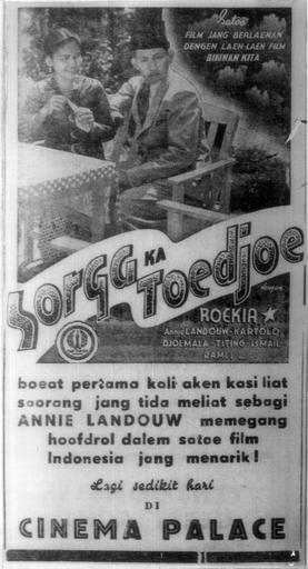 | Keywords: Sorga Ka Toedjoe in Pemandangan.jpg en Malay language advertisement for Tan's Film's Sorga Ka Toedjoe 1940 Untitled Pemandangan October 19 1940 n p Clipping accessed at Sinematek Indonesia Uncredited likely employee of Tan's Film Custom license marker 2014 04 06 Per https //commons wikimedia org/w/index php title Commons_talk Licensing oldid 76361879 Colonial_copyright_and_URAA this discussion extension of the copyright of works from the Dutch East Indies by the URAA would have considered Indonesian copyright law and not Dutch law As such this work is public domain in all relevant territories PD-1996 PD-IDOld-Art30 Anonymous-EU Uploaded with UploadWizard Sorga ka Toedjoe Advertising in print media Roekiah Djoemala |