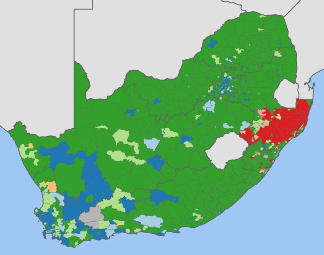 Keywords: South Africa municipal election 2006 PR winner by ward.svg 33a03c African National Congress majority b2df8a African National Congress plurality 1f78b4 Democratic Alliance majority a6cee3 Democratic Alliance plurality e31a1c Inkatha Freedom Party majority fb9a99 Inkatha Freedom Party plurality ff7f00 Independent Democrats majority fdbf6f Independent Democrats plurality 666666 Other party majority b5b5b5 Other party plurality Colours calculated from IEC election result spreadsheets and applied to File South Africa electoral wards blank svg Htonl 2010-03-12 2006 South African municipal election maps |