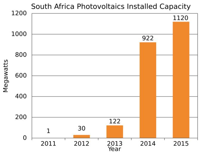 | Keywords: South Africa Photovoltaics Installed Capacity.svg translate yes en Installed photovoltaics in South Africa from 2011 to 2015 http //www iea-pvps org/fileadmin/dam/public/report/PICS/IEA-PVPS_-__A_Snapshot_of_Global_PV_-_1992-2015_-_Final_2_02 pdf IEA-PVPS 2016-05-04 own Delphi234 other versions cc-zero Solar energy in South Africa Photovoltaic power statistics | ||||