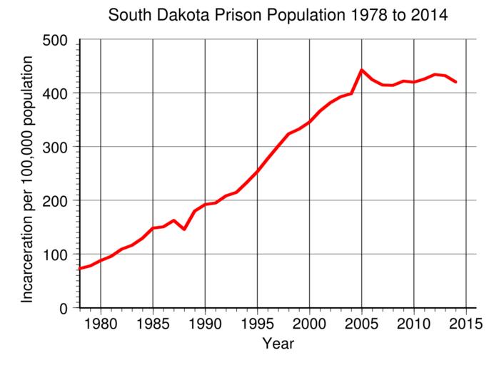 | Keywords: South Dakota Prison Population.svg en South Dakota prison incarceration rate per 100 000 population from 1978 to 2014 Data from http //www bjs gov/index cfm ty nps BJS 2016-05-11 own Delphi234 other versions current annually Generated with Wikimedia SVG Chart SVG Chart/box cc-zero Prisons in South Dakota Imprisonment and detention rates in the United States |