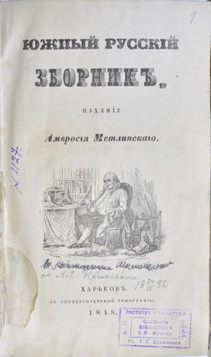 Keywords: South Russian Anthology 1309.jpg Південно- усська збі ка Ха ків 1848 Титульний а куш З особистої бібліотеки І Ф анка South Russian Anthology Kharkiv 1848 Title page From I Franko personal Library 1848 Institution Shevchenko Institute of Literature Digital Collection PD-old-70-1923 Franko Personal Library Libraries in Ukraine Collections of books in libraries in Ukraine Shevchenko Institute of Literature Uploaded with VicuñaUploader |