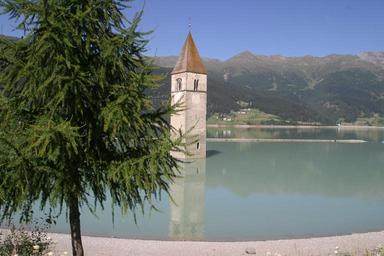 Keywords: south tyrol italy val venosta sunken church lake mountains steeple