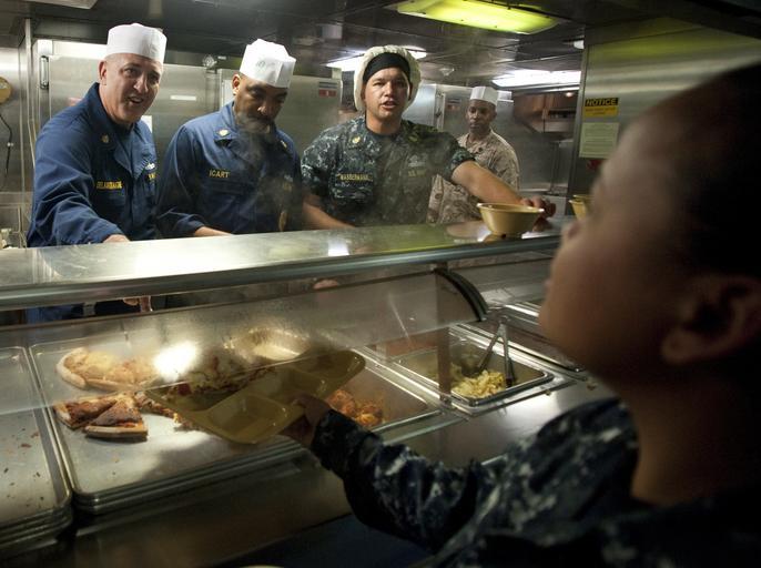 | Keywords: Southern Partnership Station 2010 DVIDS294764.jpg en Chief Petty Officer Robert DelaMontaigne Seaman Gerard Icar and Senior Chief Petty Officer Scott Wasserman offer a Sailor their recommendations as the Navy and Marine Corps senior enlisted on board USS New Orleans take over galley duties for dinner Amphibious Squadron 5 USS New Orleans and embarked Navy and Marine Corps units are participating in Southern Partnership Station 2010 a combined amphibious exercise designed to enhance cooperative partnerships with maritime forces from Argentina Mexico Peru Brazil Uruguay and Colombia 2010-06-26 Petty Officer 1st Class Brien Aho https //www dvidshub net/image/294764 100626-N-+++++-041 2010-06-29 10 52 USS NEW ORLEAN AT SEA PD-USGov-Military-Navy Southern Partnership Station 2010 Images from DoD uploaded by Fæ |