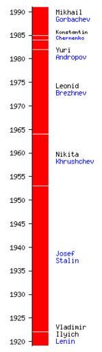 | Keywords: Sovietleaders.png  en time line demo http //infodisiac com/Wikipedia/EasyTimeline/Introduction htm EasyTimeline 2010-06-22 Src code EasyTimeline <pre> <timeline> ImageSize width 160 height 550 PlotArea width 25 height 530 left 50 bottom 10 AlignBars justify DateFormat yyyy Period from 1919 till 1991 TimeAxis orientation vertical ScaleMajor unit year increment 5 start 1920 there is no automatic collision detection so shift texts up or down manually to avoid overlap Define dx 25 shift text to right side of bar PlotData bar Leaders color red width 25 mark line white align left fontsize S from start till 1922 shift dx 15 text Vladimir~Ilyich~Lenin from 1922 till 1953 shift dx 5 text Josef~Stalin from 1953 till 1964 shift dx 5 text Nikita~Khrushchev from 1964 till 1982 shift dx 5 text Leonid~Brezhnev from 1982 till 1984 shift dx -12 text Yuri~Andropov from 1984 till 1985 shift dx 4 text Konstantin~Chernenko fontsize XS from 1985 till end shift dx 10 text Mikhail~Gorbachev </timeline> </pre> Heads of state of the Soviet Union Timelines Images with EasyTimeline source code |