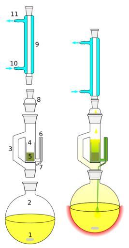 | Keywords: Soxhlet extractor.svg 1 Stirrer bar/anti-bumping granules 2 Still pot extraction pot - still pot should not be overfilled and the volume of solvent in the still pot should be 3 to 4 times the volume of the soxhlet chamber 3 Distillation path 4 Soxhlet Thimble 5 Extraction solid residue solid 6 Syphon arm inlet 7 Syphon arm outlet 8 Reduction adapter 9 Condenser 10 Cooling water in 11 Cooling water out Soxhlet extractor http //en wikipedia org/wiki/Soxhlet extractor 2006-10-27 Original PNG by Quantockgoblin SVG adaptation by Slashme Other versions left 65px svg version based on png version by Quantockgoblin - Soxhlet extractor Condensers chemistry laboratory equipment Laboratory distillation apparatus |