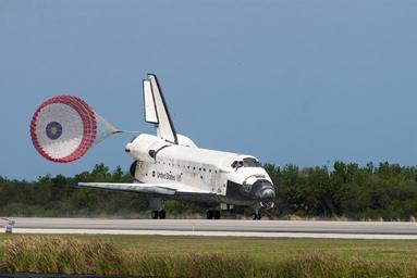 Keywords: space shuttle discovery landing drag chute runway space astronauts flight mission arrival approach transportation cosmos aviation spaceship