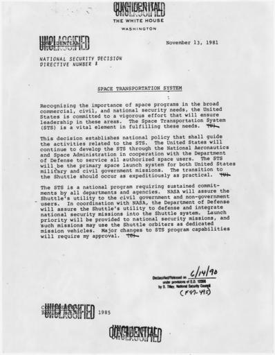 | Keywords: Space Transportation System - NARA - 198173.jpg Scope and content General notes 198173 Local identifier President 1981-1989 Reagan National Security Council 1981 - 1989 Ronald Reagan Library NLRR 40 Presidential Drive Simi Valley CA 93065-0600 1981-11-13 Record group Collection RR-NSC Numbered National Security Policy Papers 1981 - 1989 Record group ARC 1189 National Security Decision Directives compiled 02/25/1981 - 01/19/1989 Series ARC 198166 File unit File unit ARC Variant control numbers NAIL Control Number NLS-NSC-NSDD-8 Other versions <gallery> File Space_Transportation_System_-_NARA_-_198173 tif tif File Space_Transportation_System_-_NARA_-_198173 jpg jpg </gallery> NARA-cooperation PD-USGov Presidential Decision Directives Reagan |