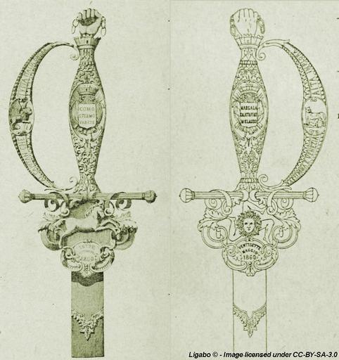 | Keywords: SpadaBeppe1860.jpg watermark sciabola d'onore offerta a Giuseppe Garibaldi dal Comitato Italiano in riconoscenza alla sua opera per l'Unità d'Italia presentati al Generale l'8 ottobre 1860 in Santa Maria Capua Vetere <br/>Il pomolo è costituito da una mano destra che fuoriesce da una corona turrita spezzando una catena e poggia sull'impugnatura finemente istoriata che reca centralmente sui due lati i nomi delle più importanti imprese garibaldine del 1859 COMO - S FERMO - VARESE e del 1860 MARSALA - CALATAFIMI - MILAZZO La guardia sembra sorreggere ad insegna i due lati del ricasso impreziositi dalle figure della triscele di Sicilia e della Marsala la cavalla prediletta di Garibaldi oltre alle date 27 MAGGIO 1860 e 7 SETTEMBRE 1860 inizio dei combattimenti a Palermo ed entrata di Garibaldi a Napoli Il paramano reca nel centro il leone di san Marco e la lupa capitolina simboli delle città di Roma e Venezia accompagnati dalle scritte AL CAPITAN CHE TUTTA ITALIA ONORA - CUI ROMA E VENEZIA AITA IMPLORA Immagini assemblate e modificate Alfredo Comandini L'italia nei cento anni del secolo XIX Tomo III 1850-1860 Antonio Vallardi Editore Milano 1907-1918 Sconosciuto - Ligabo 1860 PD-old Giuseppe Garibaldi Triskelion Sicily |