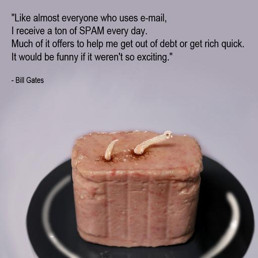 Keywords: spam worm spamworm spam food email bill gates billgates worm ENJOY the Sketch it is to honor the new SPAM SPAM SPAM folder: The funny par is that some people haven't noticed and responded to the SPAM post! forums.delphiforums.com/aphorism/messages/?msg=637.1 "Like almost everyone who uses e-mail, I receive a ton of spam every day. Much of it offers to help me get out of debt or get rich quick. It would be funny if it weren't so exciting." Bill Gates ENJOY the Sketch it is to honor the new SPAM SPAM SPAM folder: The funny par is that some people haven't noticed and responded to the SPAM post! forums.delphiforums.com/aphorism/messages/?msg=637.1 "Like almost everyone who uses e-mail, I receive a ton of spam every day. Much of it offers to help me get out of debt or get rich quick. It would be funny if it weren't so exciting." Bill Gates |