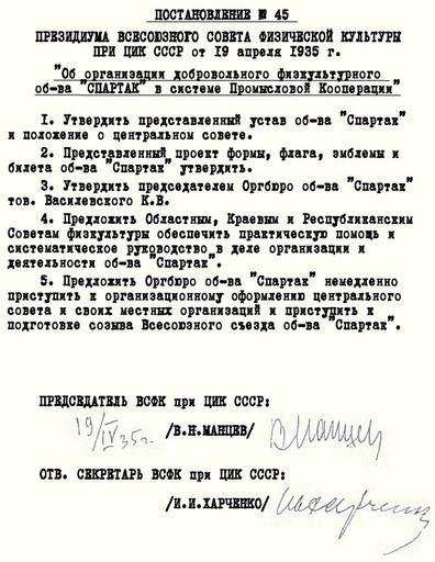 Keywords: Spartak created.jpg Decree about creation of Spartak society 19 april 1935 Постановление П езидиума всесоюзного совета физической культу ы о создании общества «Спа так» 19 ап еля 1935 г Source http //www spartak70 ru/history/1935-1940/278 html PD-RU-exempt 1935 FC Spartak Moscow |