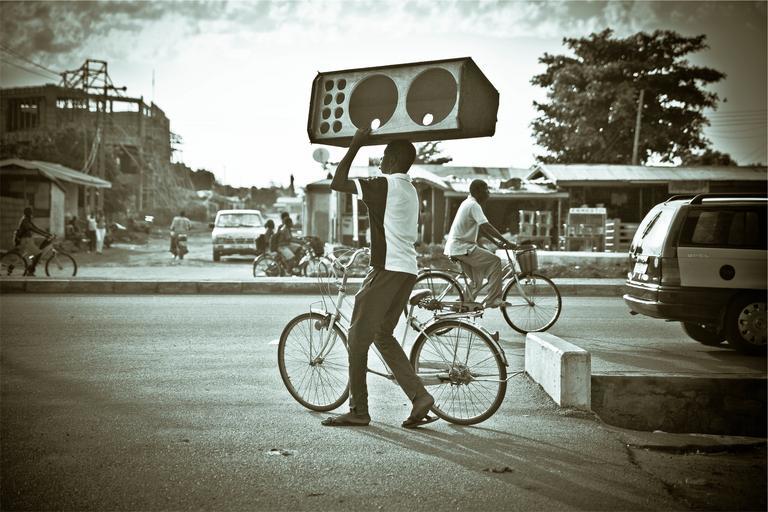 MAKE A MEME View Large Image speaker box people bikes bicycles cyclist street road town