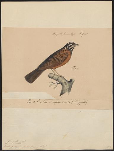 | Keywords: Special Collections University of Amsterdam - Iconographia Zoologica - UBA01 IZ1207724 - Emberiza tahapisi Smith, 1836 - Unknown artist - Print - 1835.tif Basis of record Artwork Scientific name Emberiza tahapisi Smith 1836 Catalog number UBA01_IZ1207724 Collection code ubainv274 Vertebrata Aves Passeres Linnaeus Tribus Conirostres Cuvier Emberizidae A Newton Emberiza Specific epithet tahapisi Infraspecific rank Infraspecific epithet Scientific name authorship Smith 1836 Nomenclatural code Kind of unit specimen Type status Life stage Individual count State or province Collection date Rüppell Neue Wirbelthiere zu der Fauna von Abyssinien gehörig Taf 30 nl De vogels zijn geordend volgens https //archive org/stream/handlistofgenera02britrich page/114/mode/2up G R Gray Hand-list of genera and species of birds 1869-1871 soortnummer 7714 en The birds have been arranged according to https //archive org/stream/handlistofgenera02britrich page/114/mode/2up G R Gray Hand-list of genera and species of birds 1869-1871 species number 7714 New box number 63 Old species name Fringillaria septemstriata Rüppell Occurrence ID Institution Special Collections of the University of Amsterdam UvA-BC Source url http //dpc uba uva nl/inventarissen/ubainv274 Upcoming link as of July 2016 Title publication Author publication Subject keywords publication Publication location Document type Title artwork artwork Zevenstrepengors Cinnamon-breasted bunting synonym Rock bunting Medium artwork Print Dimensions artwork Kind of unit artwork Subject keywords artwork Other versions artwork Permission license PD-old-100-1923 Iconographia Zoologica Images from the Special Collections of the University of Amsterdam Emberiza tahapisi |