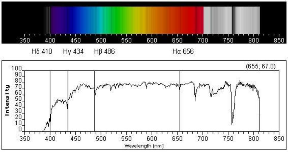 | Keywords: Spectra.Classical&Function.jpg Solar spectrum with Fraunhofer lines corresponding intensity vs wavelength plot IR and UV areas are grayed<br/> Hydrogen Balmer lines Hα-δ are marked as vertical lines <br/> Created with Virtual Spectroscope http //mo-www harvard edu/Java/MiniSpectroscopy html online version Own 2007-11-20 Kurgus Solar spectra |