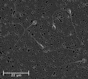 Keywords: Spermatozoa-human-1000x.jpg en Micrograph by scanning electron microscope SEM of human sperm cells spermatozoa magnified 1000 times no Spermier fra menneske Bildet er tatt ved hjelp av scanning elektronmikroskop SEM på 1000 gangers forstørrelse own No specific author 2010-10-14 PD-URAA-Simul country URAA date reason Pore size of the polycarbonate filter in the background is 1µm Semen